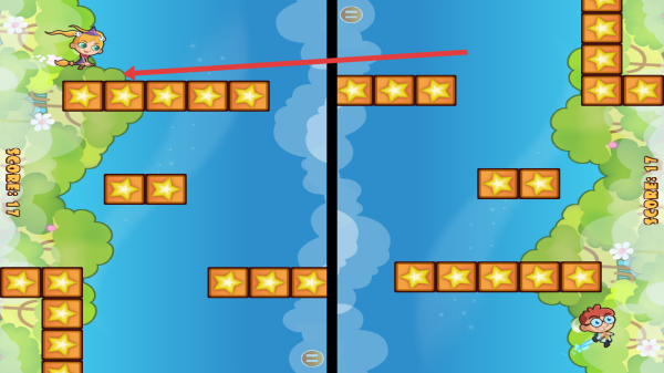 1、关卡中,操控两侧角色(魔法女孩/科学男孩),沿箭头方向跳跃,收集星星(黄色方块),避开空隙,同步移动保持节奏。