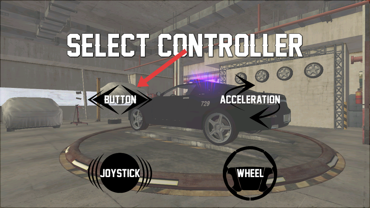 2、在警车极速漂移的系统操控选择页,可以选定【BUTTON】操控模式,为驾驶操作做准备。