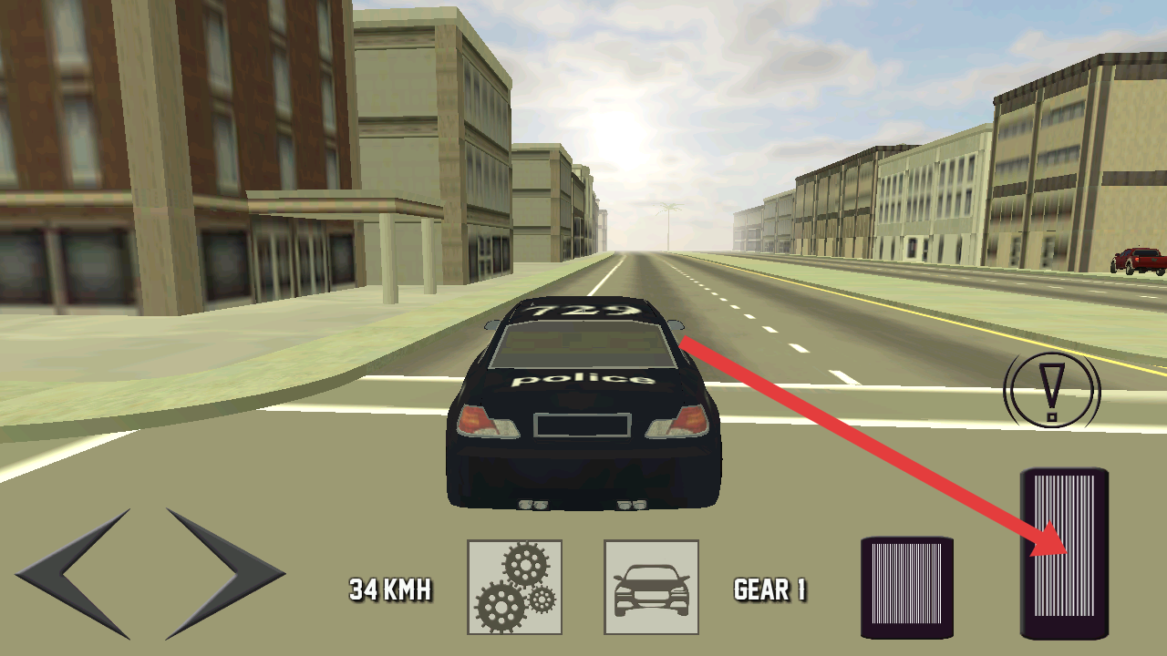 3、进入游戏内,需要点击右下角条纹加速键,操控警车在城市道路加速行驶,推进游戏。