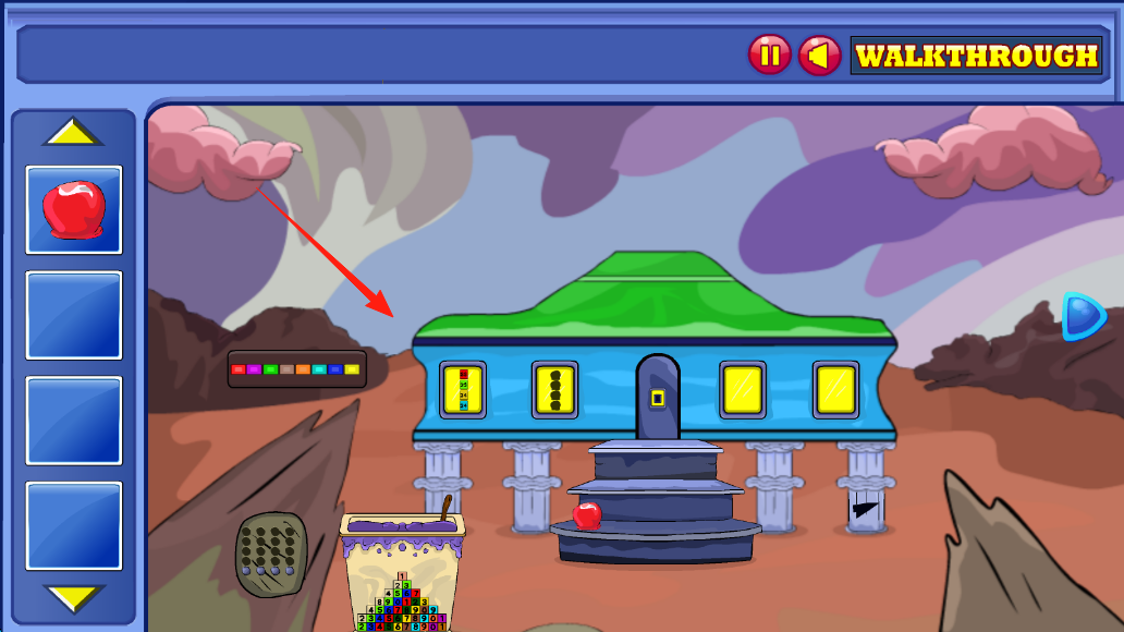 1、探索场景,收集苹果道具,根据房屋线索,找颜色面板,尝试解锁机关。