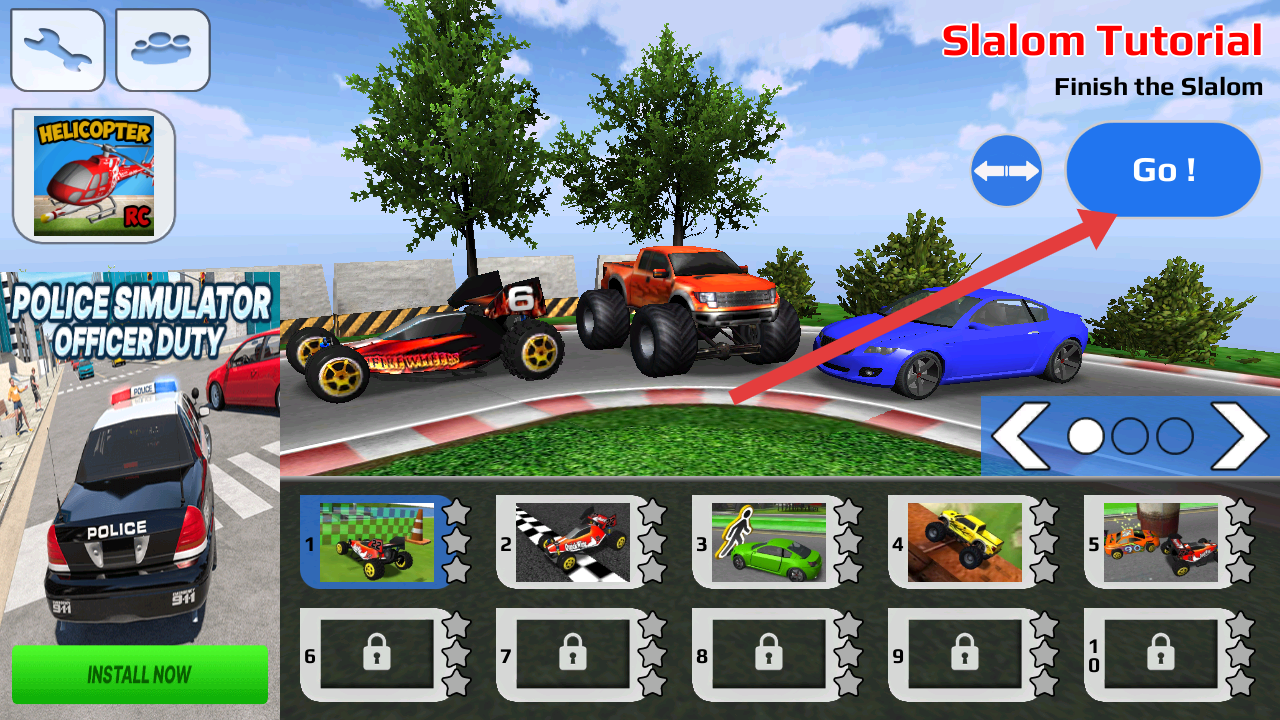 1、在游戏车辆选择的界面,需要点击右上角蓝色【Go】按钮,开启赛车障碍挑战关卡。