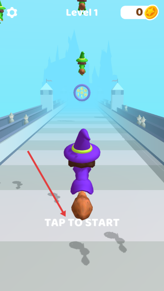 1、点击【TAP TO START】,操控紫色巫师角色,沿箭头方向出发,开启城堡跑道竞速之旅。