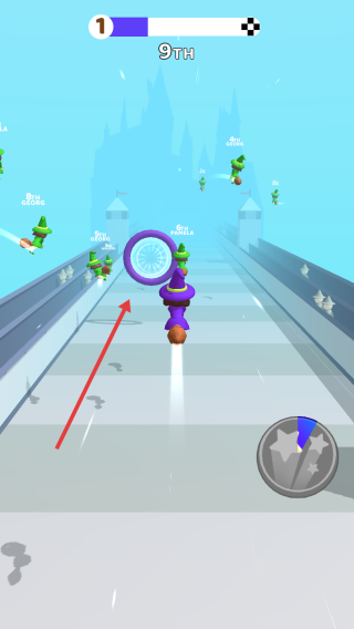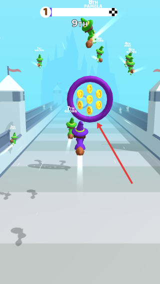 2、行驶中瞄准带金币的紫色圆环,按箭头指引穿越,收集金币,同时避开绿色小巫师障碍。
