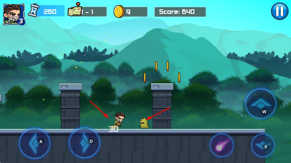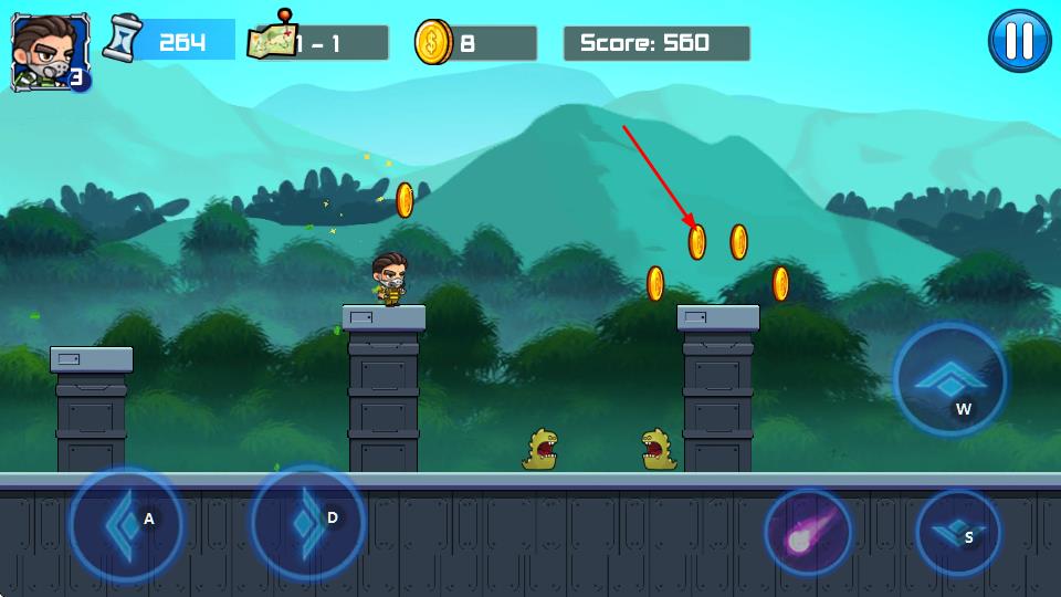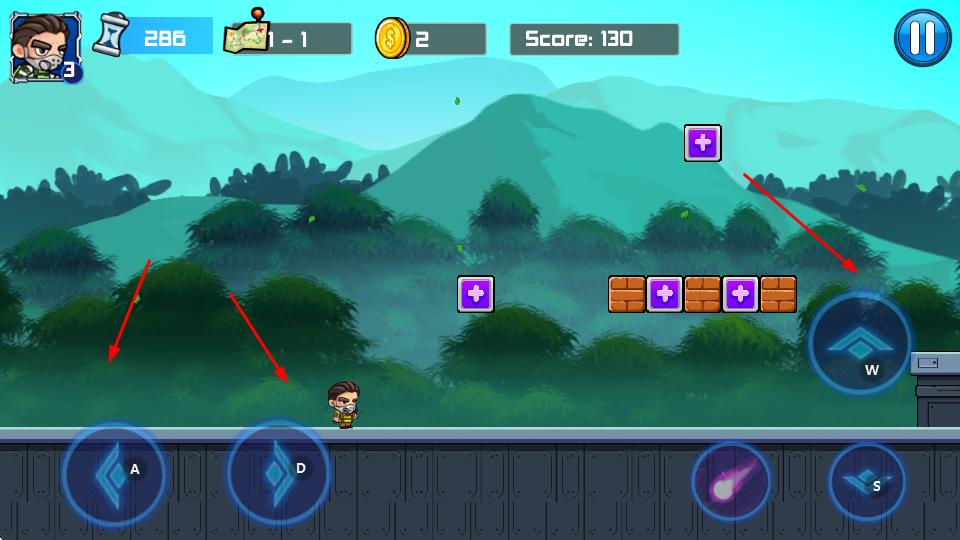 1、用按键控制角色左右移动跳跃,跨越障碍、躲避危险,在场景中推进。