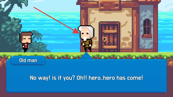 1、与红箭头指向的【Old man】对话,触发“hero has come”剧情,开启游戏任务。