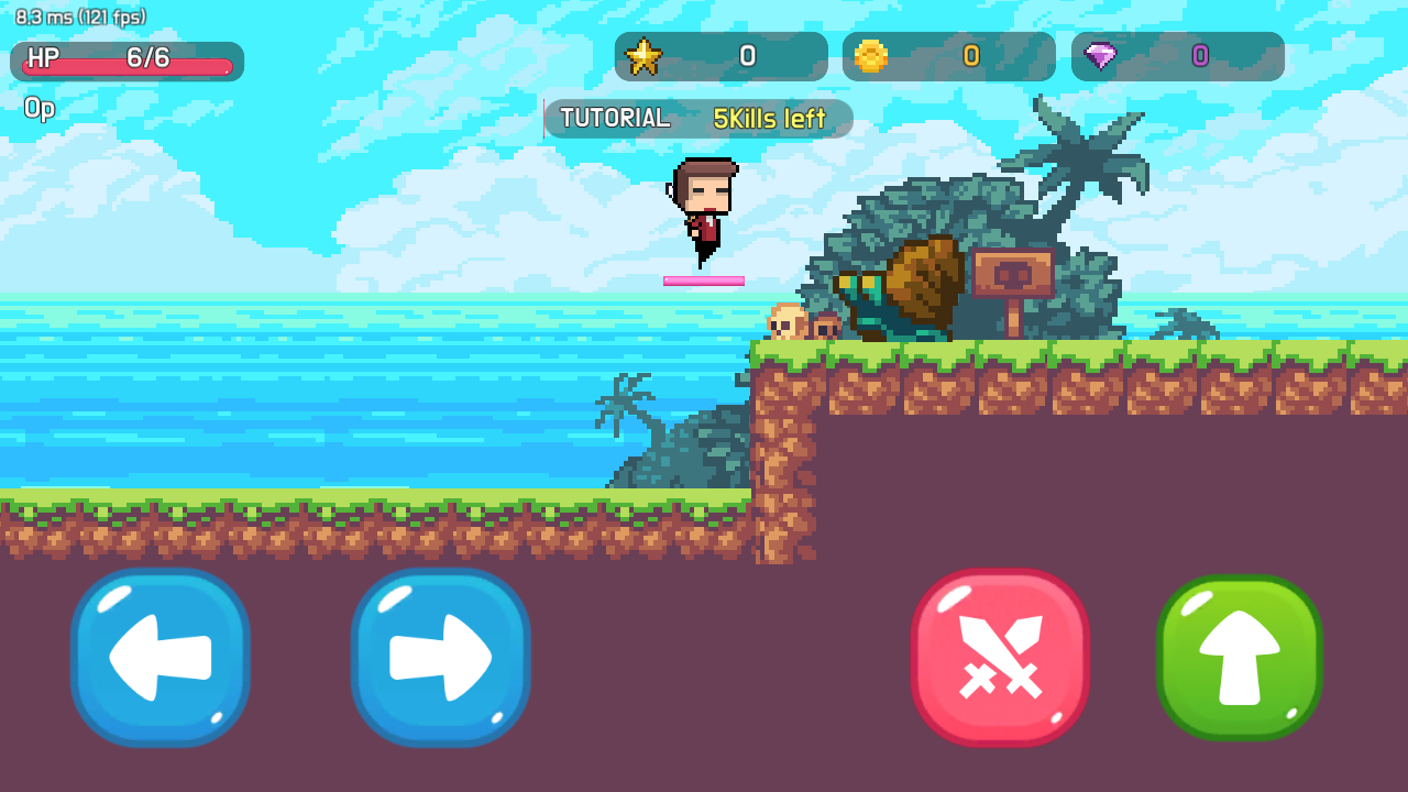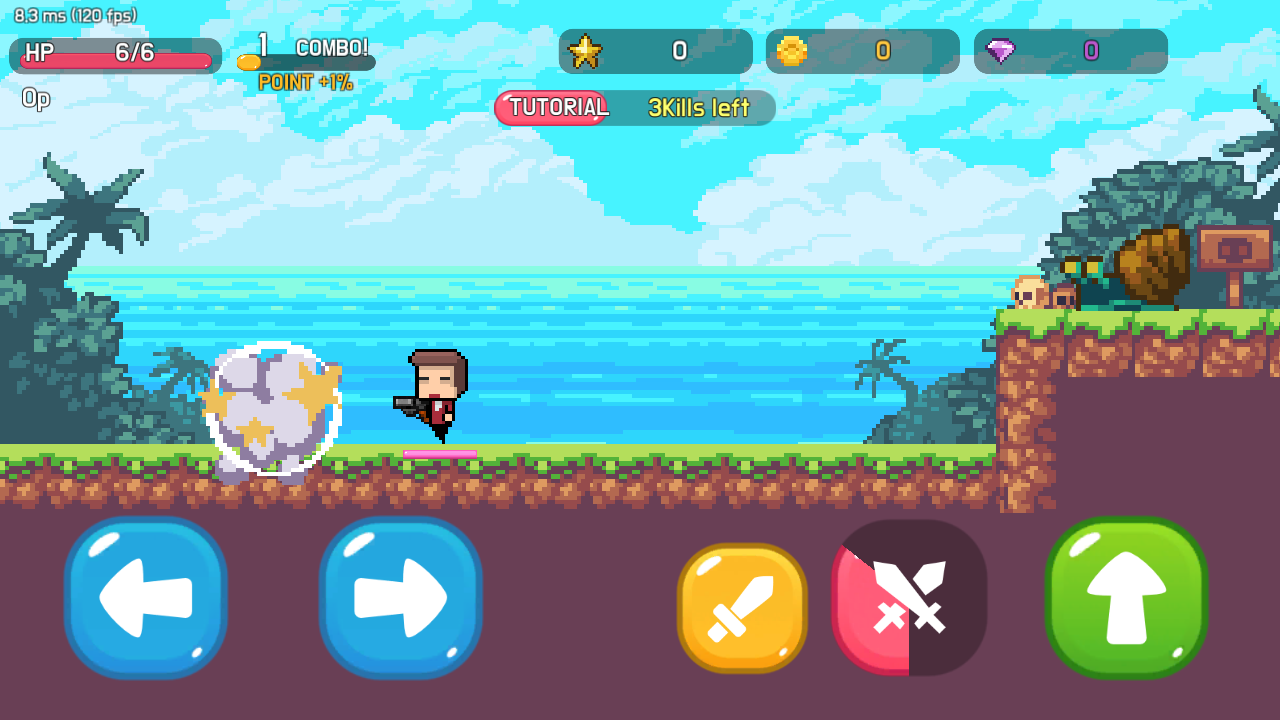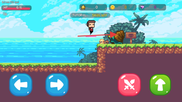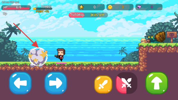 2、按【TUTORIAL 5kills left】,操控角色移动(左右键),用红剑按钮攻击箭头指向怪物。