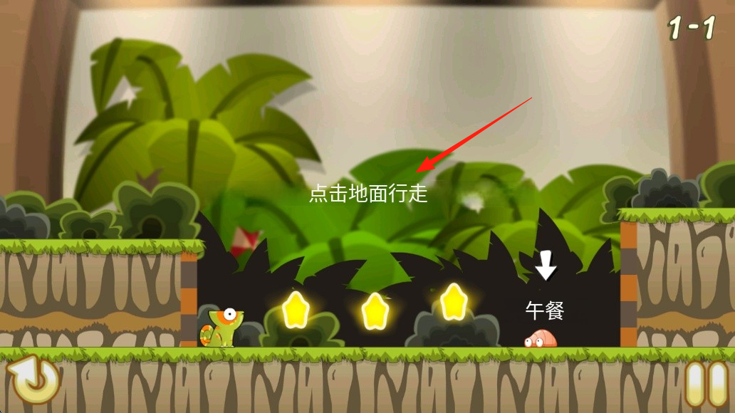 1、点击地面控制角色行走,收集星星,避开障碍,到达午餐处,完成关卡。