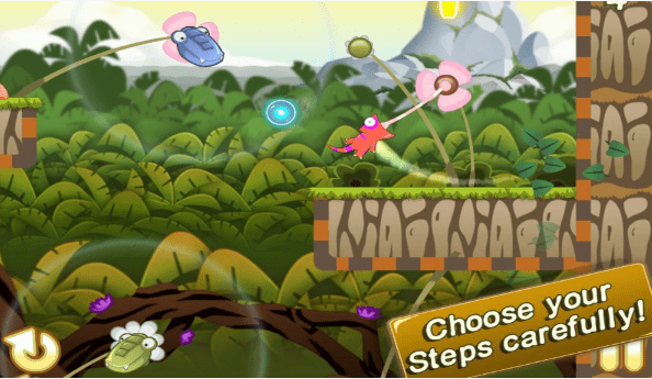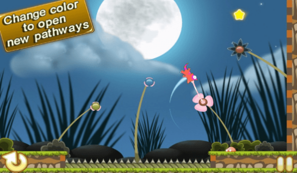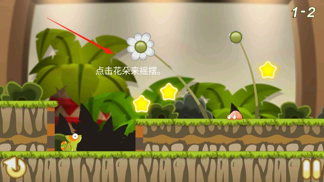 3、新关卡点击花朵让其摇摆,借助摇摆力,帮助角色跨越地形,收集星星。