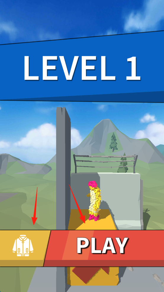 1、关卡1(LEVEL1)开始界面,有“PLAY(开始)”按钮,角色站在场景中,背景是山水。