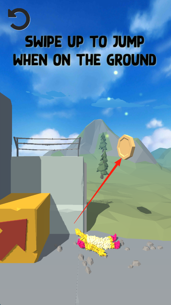 2、游戏操作指引界面,显示“SWIPEUPTOJUMPWHENONTHEGROUND(在地面时向上滑动跳跃)”,角色需跳跃获取金币。
