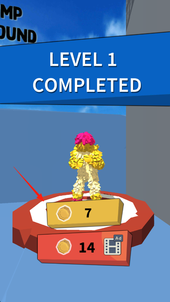 3、关卡1完成界面(LEVEL1COMPLETED),角色站在领奖台,可领取7金币(看广告得14)。