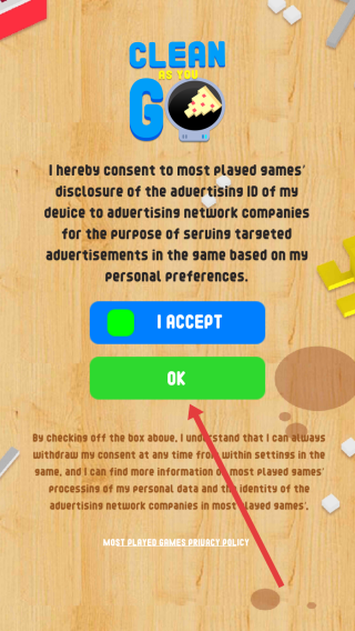 1、进入游戏,勾选【I-ACCEPT】,点击【OK】,同意隐私政策,解锁游戏启动权限,准备开始清洁挑战。