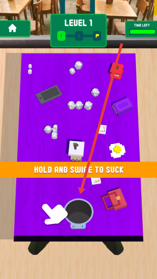 3、LEVEL-1中,按住并滑动(HOLD-AND-SWIPE-TO-SUCK),操控吸尘器清理紫色桌面杂物,完成清洁任务。