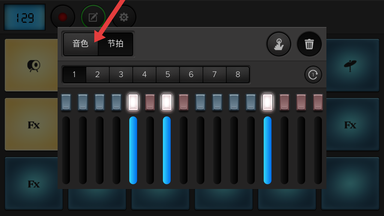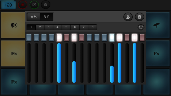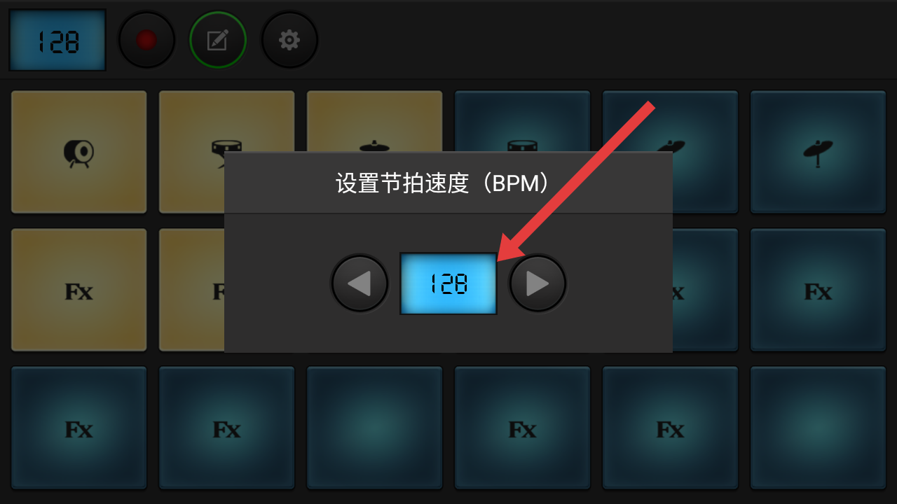 1、在节拍速度设置弹窗中,点击左右箭头按钮,可调整【128】数值,设定音乐的节拍速度(BPM)。