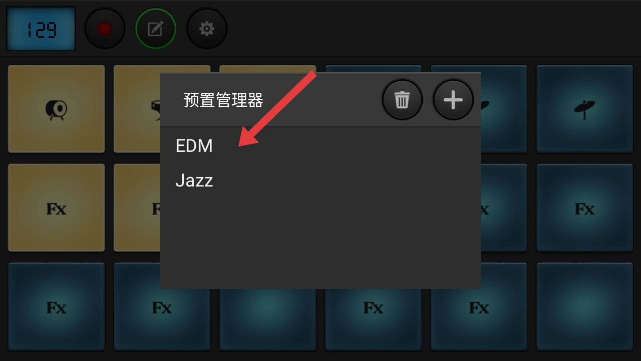 2、打开预置管理器,选择【EDM】选项,可以快速调用该风格的预设参数,搭建音乐基础框架。