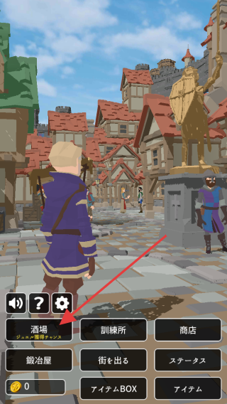 2、进入城镇,可选择【酒場】【訓練所】等建筑互动,点击【街を出る】开启冒险,积累金币。