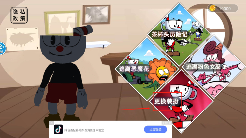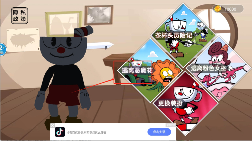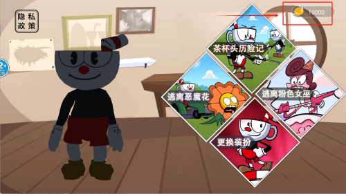 1、进入游戏主界面查看右上角金币数量10000,点击茶杯头历险记选项开始冒险,准备挑战首个关卡。