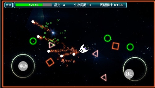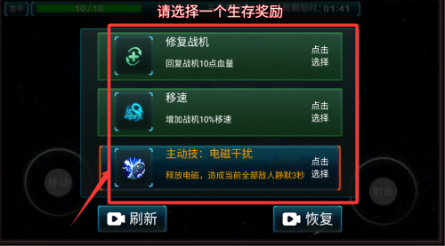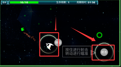 1、游戏开始先熟悉基础操作,左侧摇杆控制战机移动,右侧按键发射子弹和释放技能。