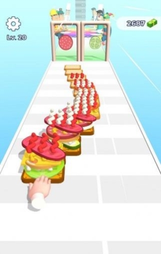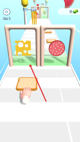 2、左右滑动控制面包,穿过奶酪、香肠等食材门,采集配料。