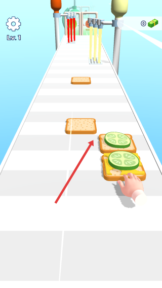 3、持续收集多层食材(如黄瓜),堆叠成三明治,完成Level1制作。