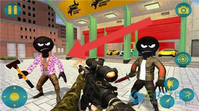 2、战斗时,瞄准箭头指向的火柴人敌人,利用枪械射击,注意躲避攻击,清除场景中的敌对目标。