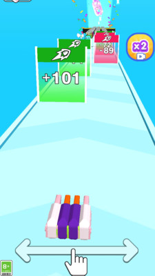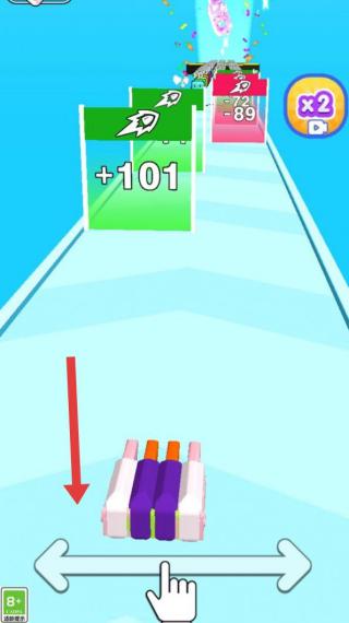 1、左右滑动控制底部彩色堆跑酷,收集+101等增益,避红色障碍。