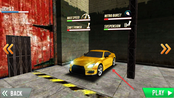 1、在初始界面,点击【PLAY】,选择金色跑车,准备开启赛车竞速。