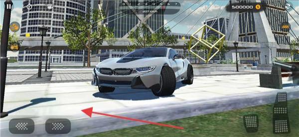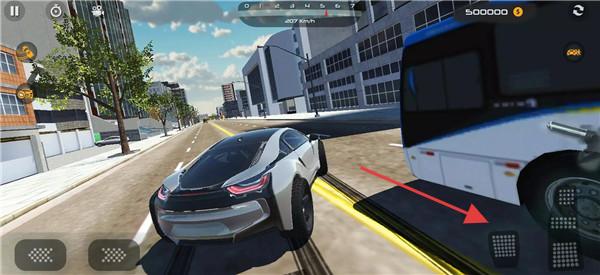 1、驾驶银色跑车,遇公交按箭头指引,操作右侧按键,灵活变道避让,继续前行。