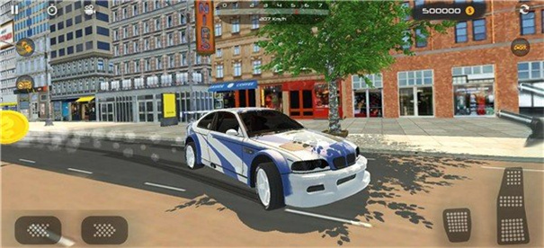 3、驾驶蓝白涂装车,沿箭头方向,在城市街道行驶,收集金币,避开障碍,完成驾驶挑战。