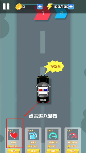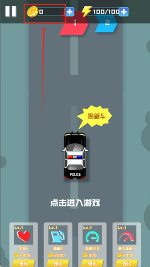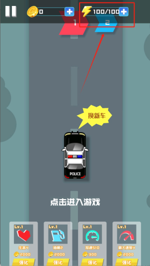 2、游戏开始后操控警车行驶,点击画框选中的闪电图标获取加速效果,注意利用黄色气泡"换新车"功能切换不同警车类型。