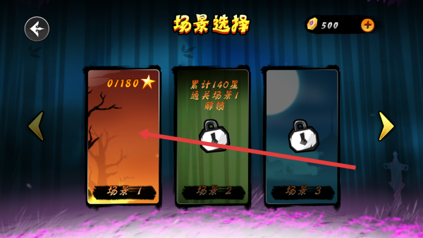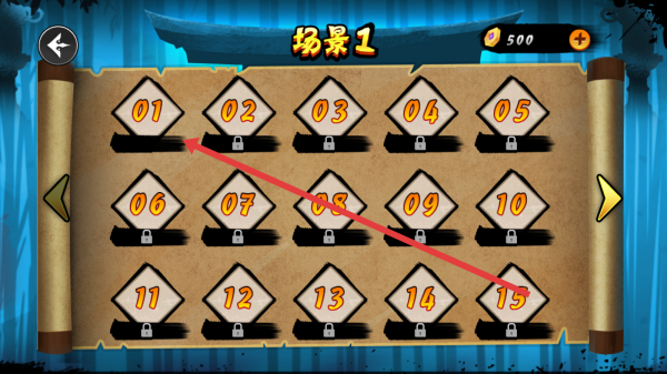 3、在场景1关卡页,选【01】关卡,开始首场战斗,操控火柴人忍者,完成任务,解锁后续关卡。