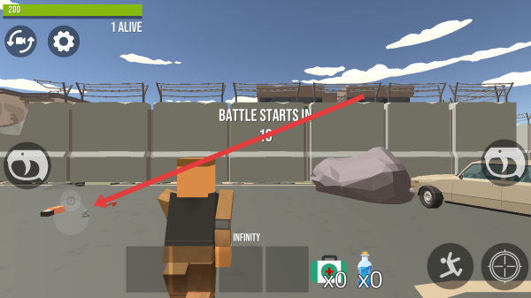 2、战斗准备阶段,按箭头指引,拾取地面武器(如橙色枪械),武装自己,等待“BATTLE-STARTS-IN”倒计时结束。