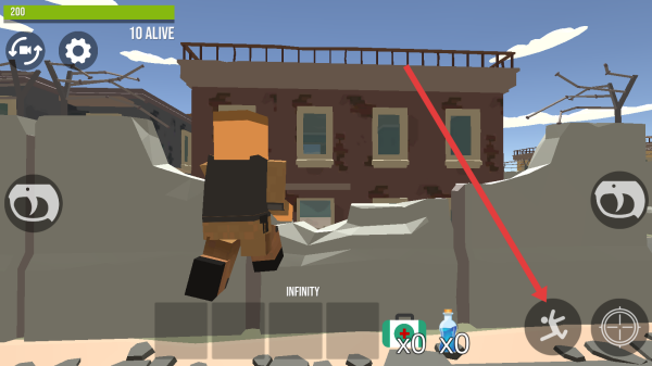 3、对战中,靠近建筑(如箭头指向的房屋),点击跳跃键(右下角),翻越障碍,探索资源、攻击敌人,争取存活到最后。