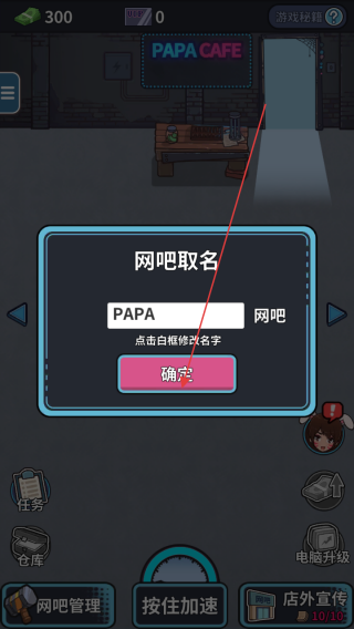 2、在“网吧取名”界面,输入心仪名称(如PAPA),点“确定”完成命名。