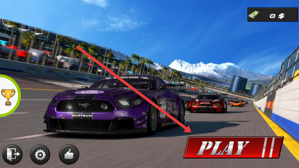 1、启动页,点击【PLAY】,进入赛车游戏,准备体验赛道竞速,驾驶紫色赛车(类似野马车型)。