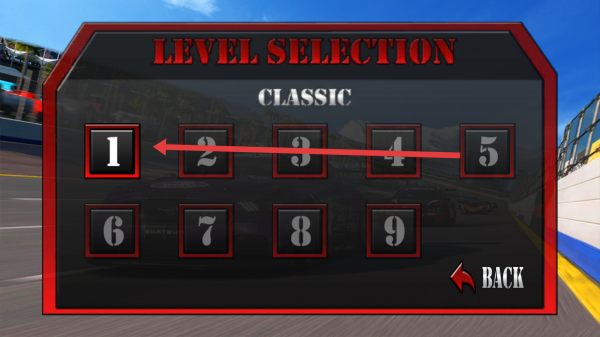 3、关卡选择,点击【1】号关卡(箭头指向),开始首关挑战,在赛道驾驶赛车,争取夺冠,解锁后续关卡。