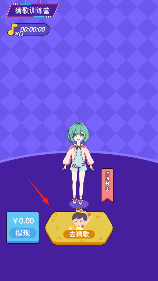 1、打开游戏会出现主界面,上面显示猜歌训练营,可以根据红色指示箭头点击去猜歌。