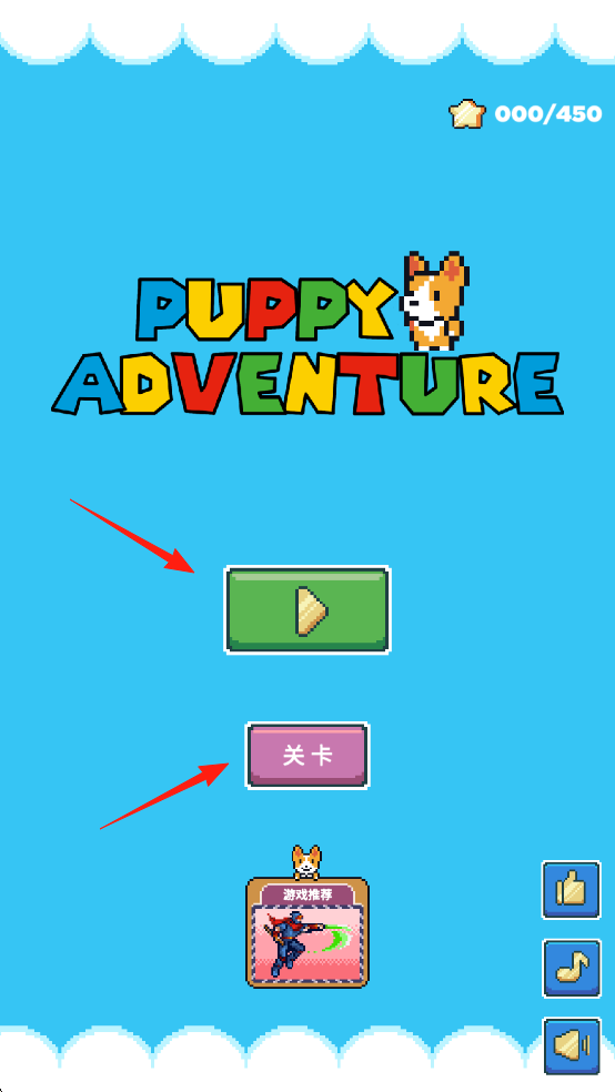 1、主界面点击绿色【播放】按钮,进入游戏,开始小狗冒险之旅。