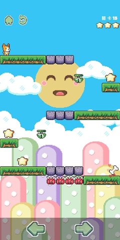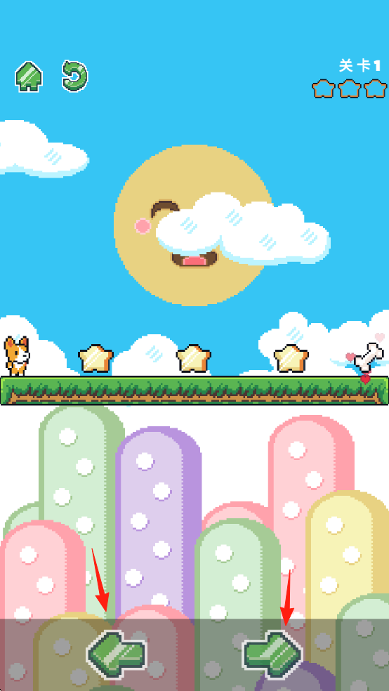 2、关卡中,用下方左右箭头按钮,控制小狗移动方向,躲避障碍。