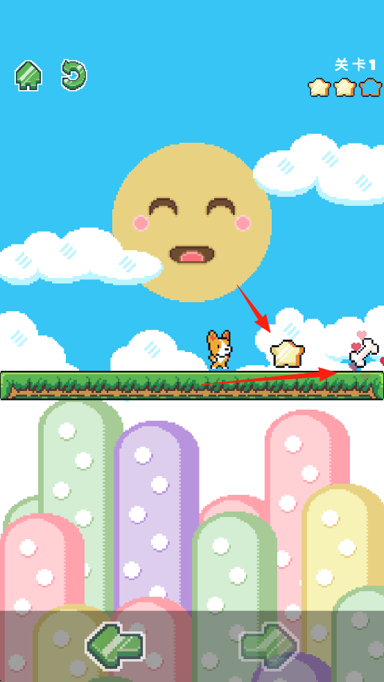3、沿途收集星星、骨头道具,按箭头指引路线,抵达终点完成关卡。