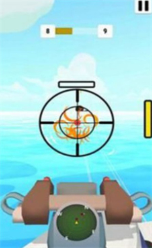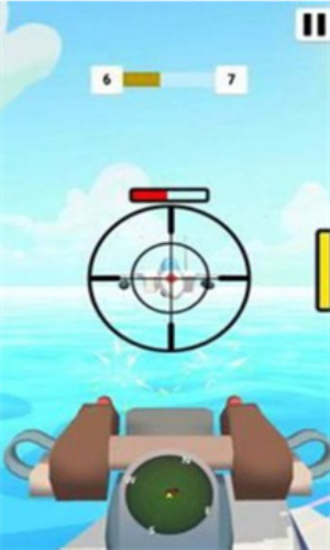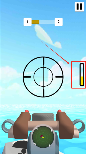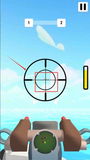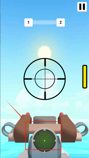 1、观察罗盘指示方向,将炮台瞄准红框标记的1号目标,注意上方数字提示调整射击角度,确保准星与目标重合。