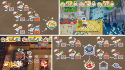 1、烹饪环节,按图示流程分配厨师,依次处理食材(切配、翻炒),联动多个工位,高效制作目标菜品。