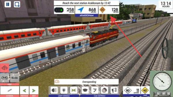 1、驾驶火车,关注顶部【Reach the next station Arakkonam by 13:42】提示,按线路行驶,留意速度、距离等数据。
