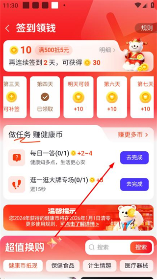 3、在签到领钱页面,通过签到、完成每日任务等方式获得健康币。