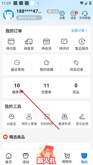 1、在方舟健客网上药店App首页点击底部的我的选项,进入个人中心页面。