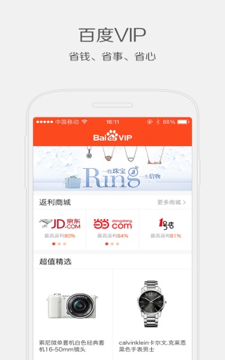 淘宝、天猫、京东、唯品会、携程……百度VIP联合数百家主流电商,购物拿返利,省钱更超值