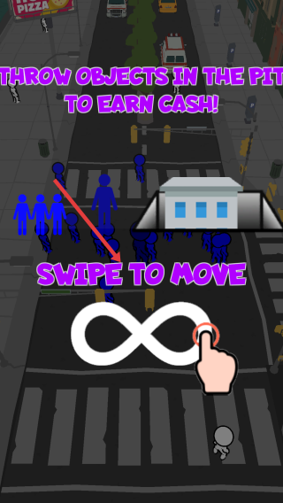 1、启动界面,提示“THROWOBJECTSINTHEPITTOEARNCASH!”,可滑动(SWIPETOMOVE)操作。