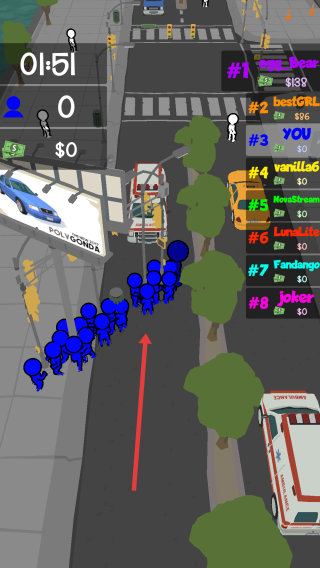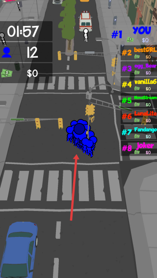 基础扩张策略:开局优先收集散落在街道的同色火柴人,避开高等级敌对队伍;利用建筑物遮挡视线,绕后吞并小规模队伍,如3-5人组,快速积累人数壮大势力。