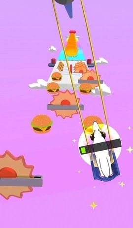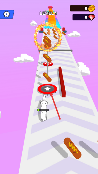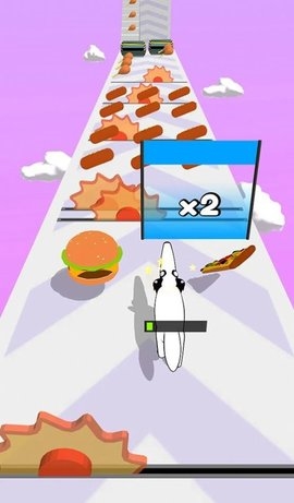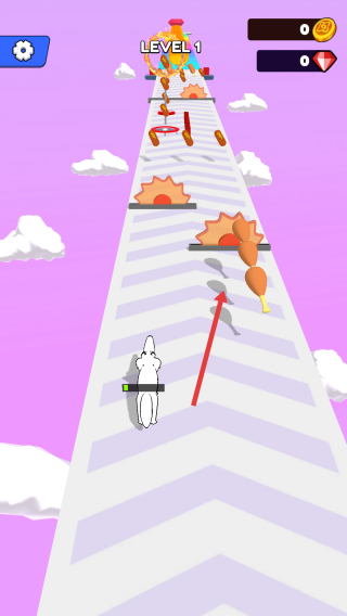 2、跑道挑战:操控兔子沿跑道前进,收集鸡腿、香肠等道具,躲避齿轮、火焰圈障碍,触发加速箭头提速度。