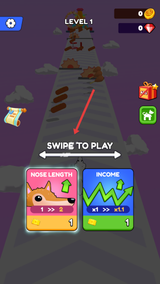 1、开局选择:LEVEL1界面,可选升级“NOSE LENGTH”(鼻子长度)或“INCOME”(收益),滑动“SWIPE TO PLAY”启动游戏。